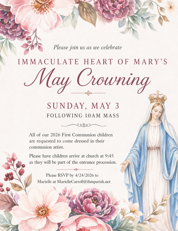 All of our 2026 First Communion children are requested to come dressed in their communion attire. Please have children arrive at church at 9:45 am as they will be part of the entrance procession.